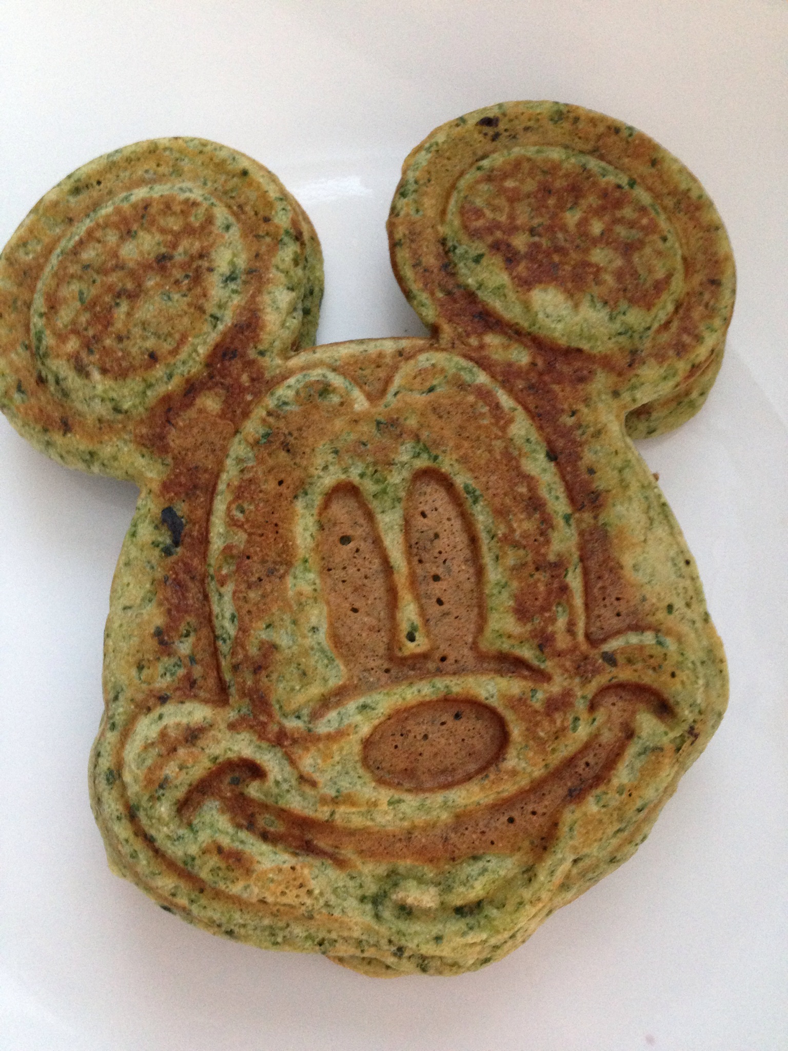 So here ya have it, healthy whole wheat flour hidden spinach pancakes (and you can use any waffle iron, but let’s be real– Mickey trumps Belgian when you are 1 and 2 years old– okay and maybe 28 years old.)