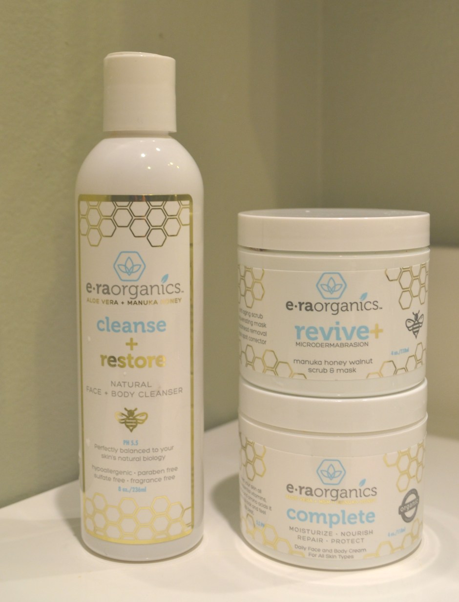 If you’ve been around here a while, you know how much I love Era Organics. I featured their baby line, Honeybuns, a while back. Its a fantastic brand with amazing products that mix organic, natural ingredients with science backed formulas that WORK. After becoming totally sold on their baby products, I decided to try out their Cleanse + Restore face wash. Instantly sold. It was in the shower, so Milkman started using it too, and even he was impressed by how much better his skin felt after using it compared to the Neutrogena face wash we had been using. I mentioned to Tyler at Era Organics how much I loved the Cleanse + Restore and he had me try out their Revive+ scrub/mask and Complete moisturizer.