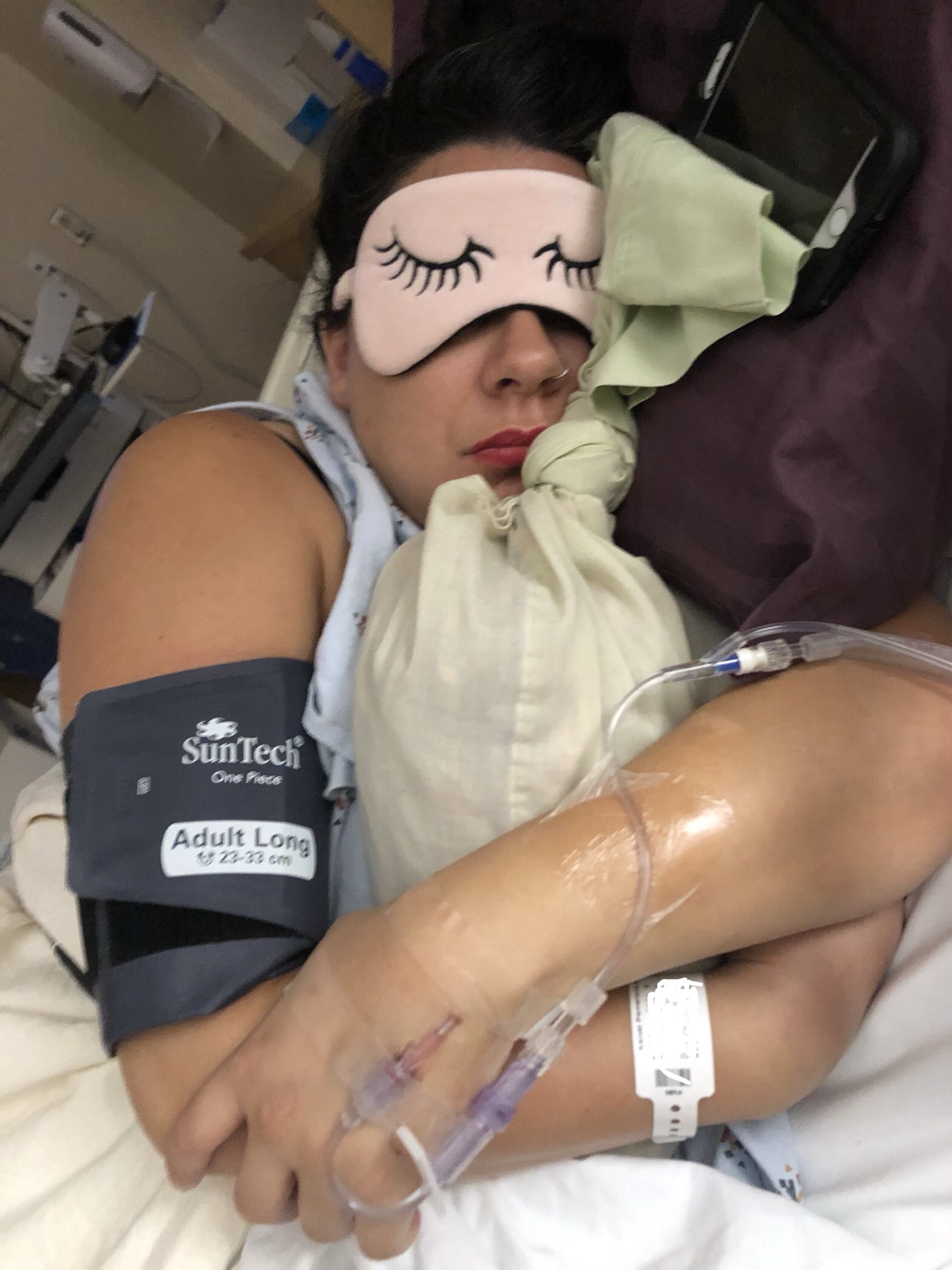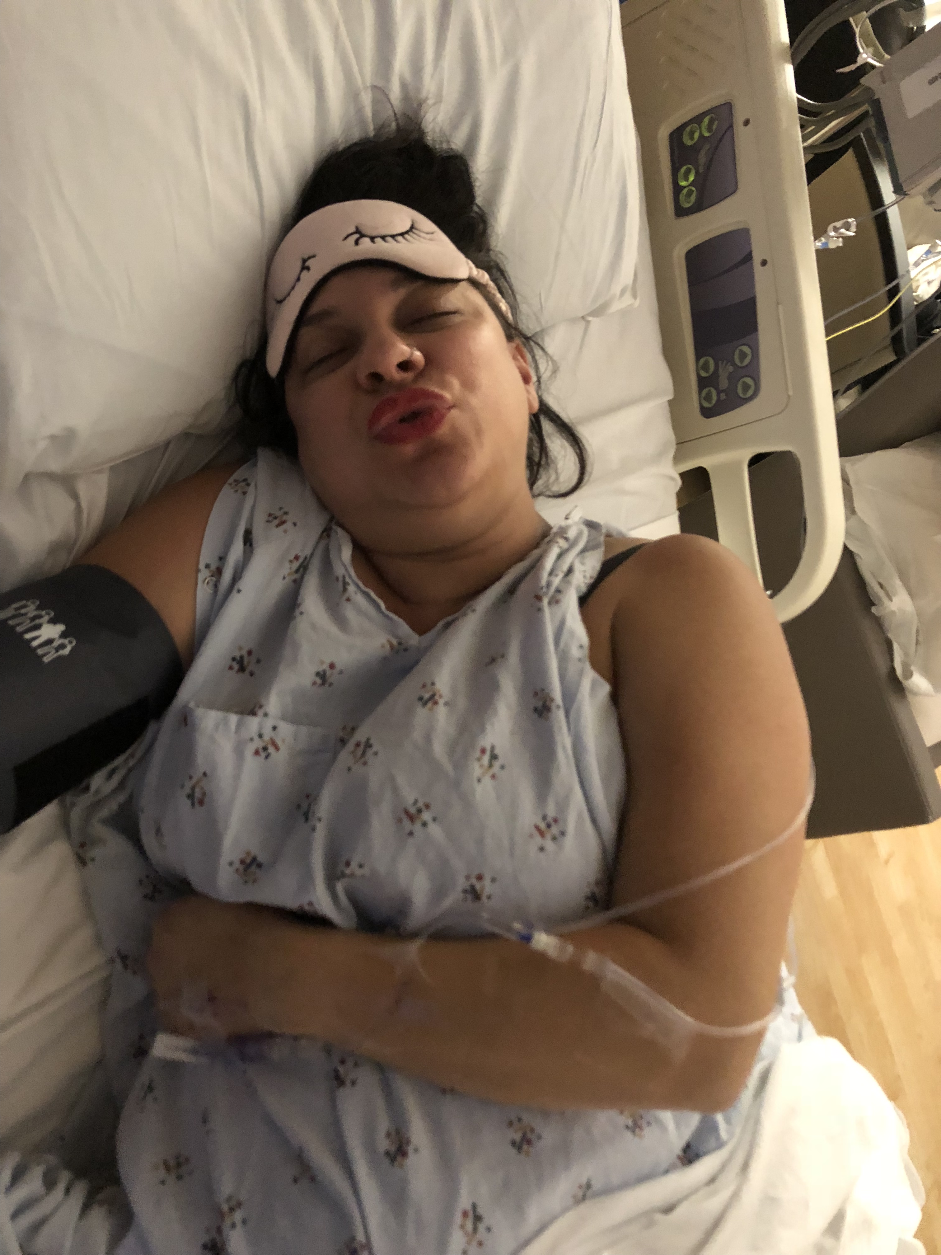 9 hours after my induction began, the midwife who delivered Mamitas walked in the room and was officially on duty. We had gotten the schedule a few days before and this was one of the few reasons I decided to stay. Linda is an exceptional midwife. She is the calm to my crazy, she is down to earth, and she can deliver a baby in any position. She is one of those people who radiates warmth, without being syrupy. Real salt of the earth. The team said they were going to check me, and since I had so many contractions they were sure I was close. I told them “pretty sure I’m not.” Guess what? No change. They said maybe a tight 3, but true to my normal, that cervix wasn’t budging. I had a good cry, snuck some food, sipped some of Milkman’s coffee, and told him I wanted to go home. Obviously, it was too late to go home, but this was for the birds. Not used to contracting and not feeling it was totally foreign, so I tried to watch TV, but that made me even more annoyed. I got moved onto my side, Milkman slipped in the bed behind me, and I put in my headphones, turned on my labor mix, pulled my sleep mask over my face, and fell asleep crying silently.