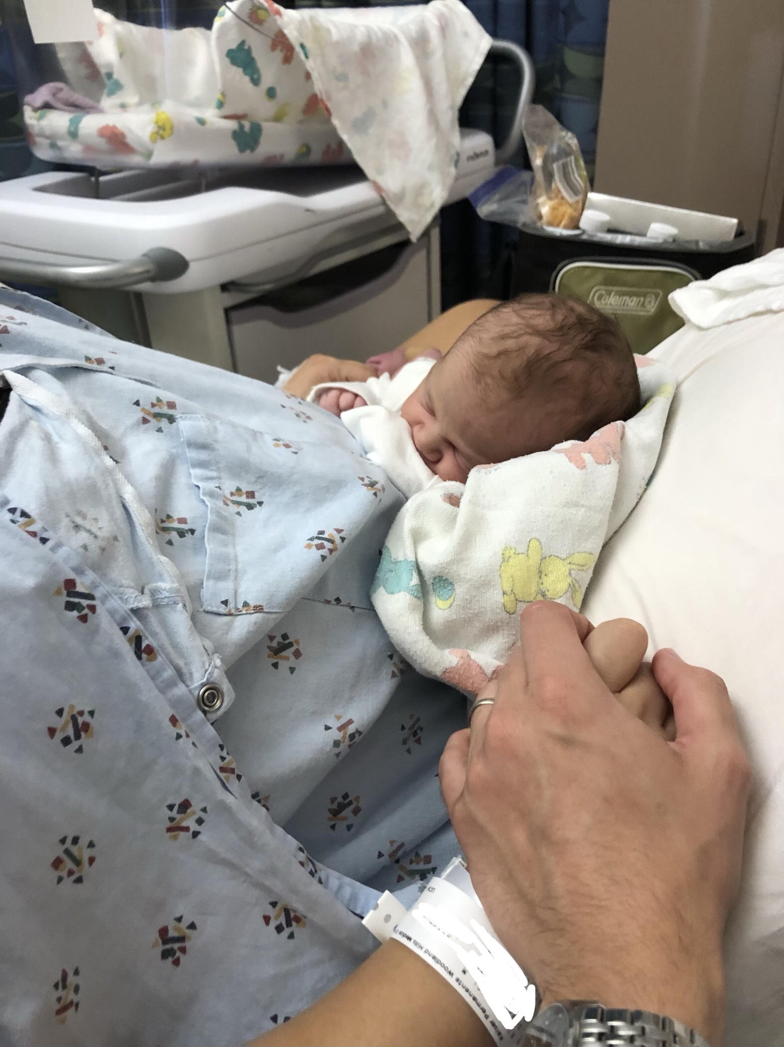 I told him they weren’t letting me come back to the room and that he needed to call my sister, it was now 5am, and tell her to come to the hospital and nurse the baby. He spoke to the nurse and said “I know it isn’t visiting hours, but I’m going to have my sister in law come nurse the baby since they aren’t releasing Rachel.” The nurse looked shocked at the thought of someone else coming in to nurse the baby and then made a call or two, and magically I was released back to my room!
